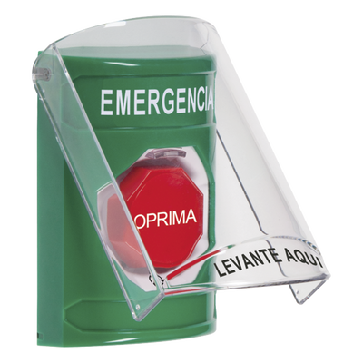 STI SS2129EMES Botón de Salida de Emergencia en Español con Tapa Protectora de Policarbonato Súper Resistente, Acción Mantenida, Girar para Restablecer