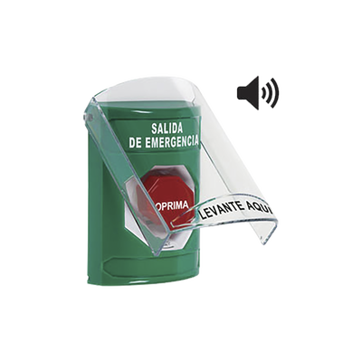 STI SS21A9EXES Botón de Salida de Emergencia en Español con Tapa Protectora de Policarbonato Súper Resistente, Acción Mantenida, Girar para Restablecer y Sirena